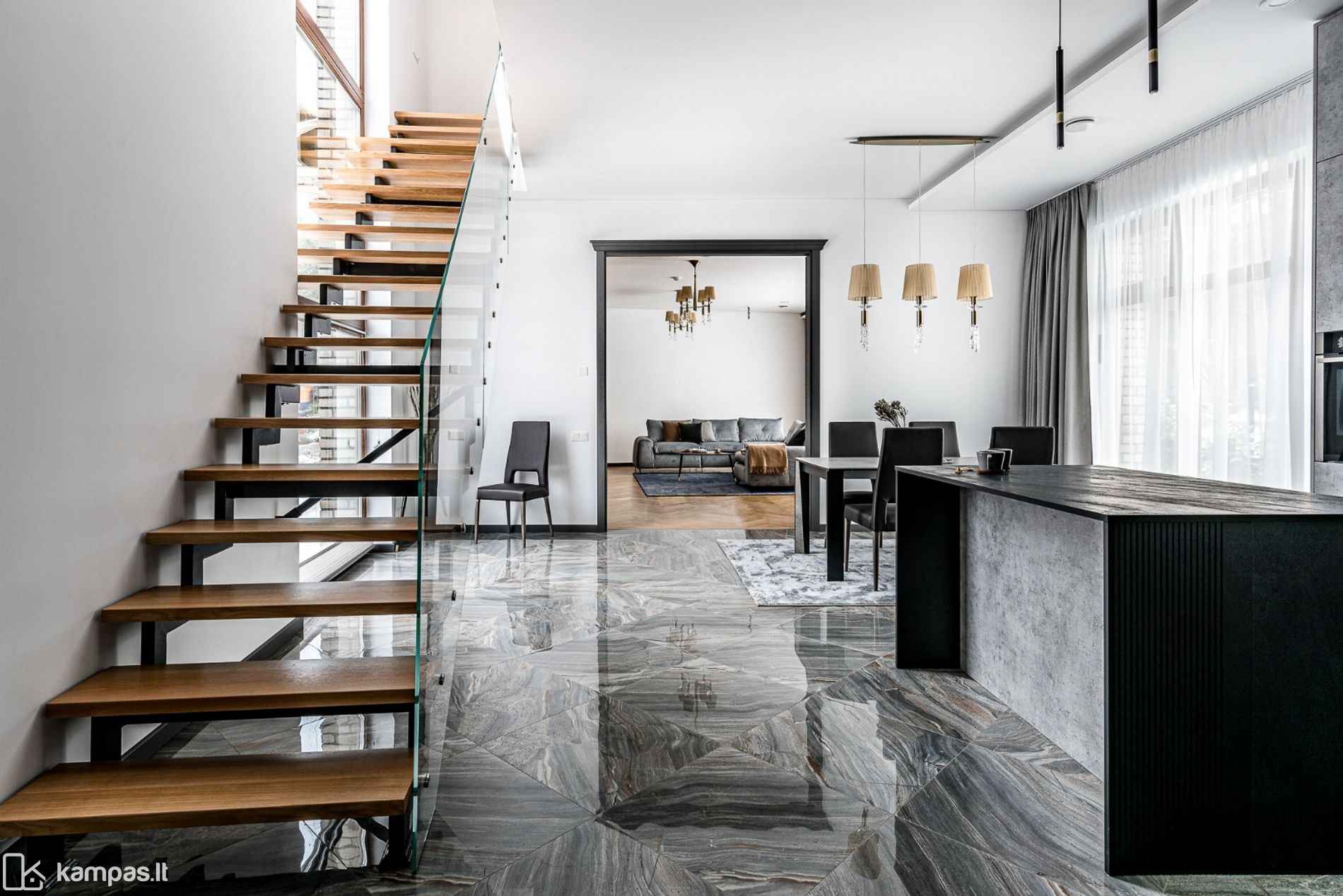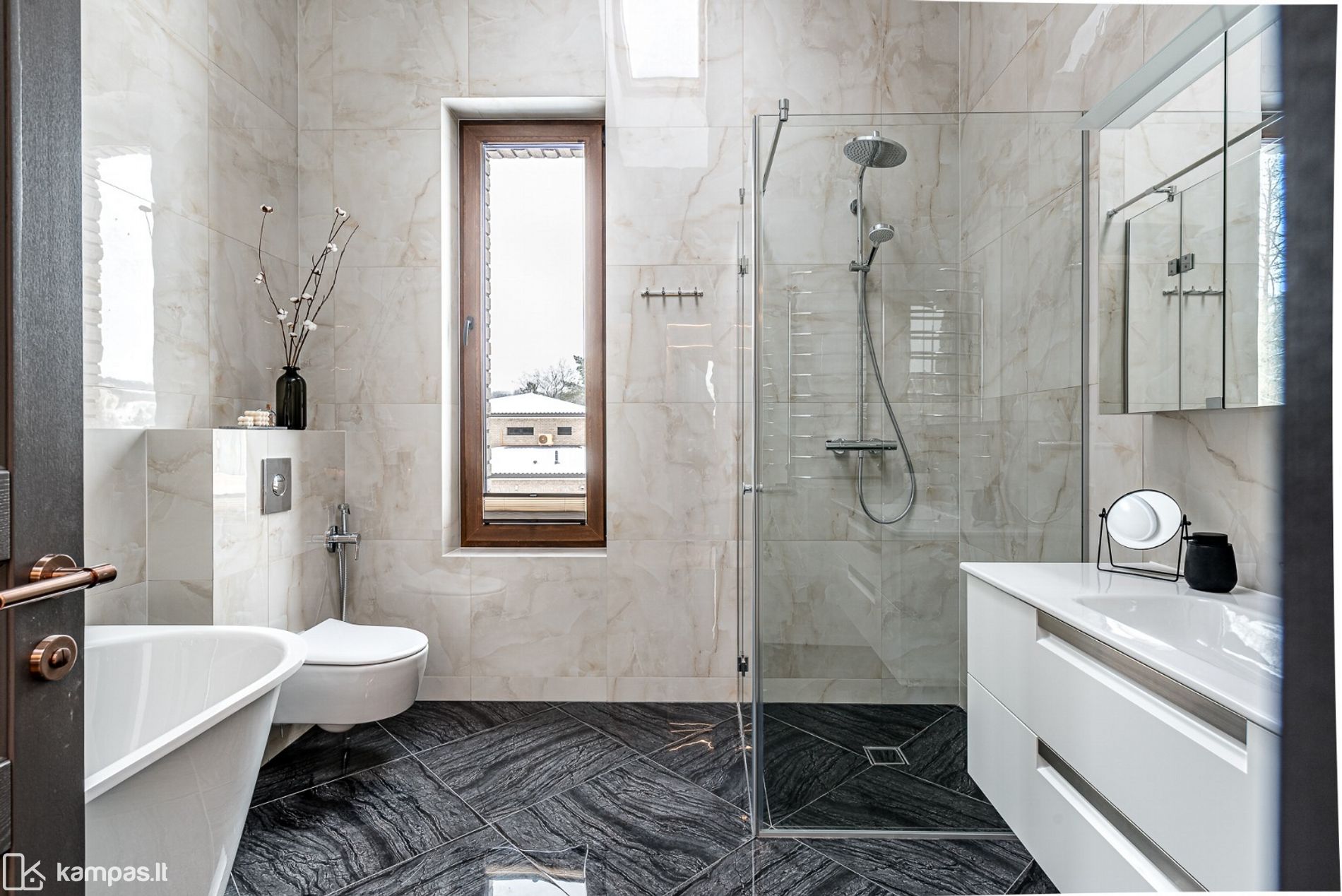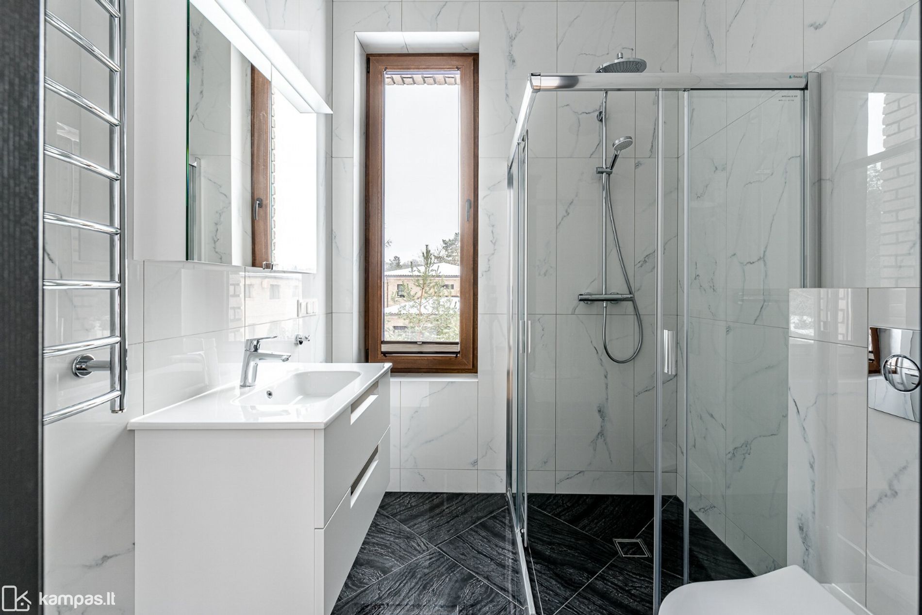• Grindys: šildomos (visame name), kokybiškos parketlentės, vonios kambariuose - plytelės